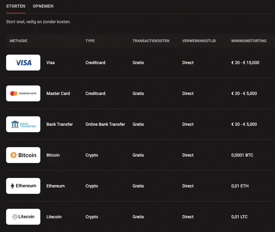 Om stortingen en opnames te doen, kun je zowel FIAT als cryptovaluta gebruiken. Dit bevestigt onze status als een inclusief casino Legion Bet dat ervoor zorgt dat iedereen mee kan doen. Deze methoden zijn geschikt voor zowel kleine als grote bedragen. Je start de storting door rechtsboven op de grote gele ’Storten’ button te klikken. Je kunt vervolgens kiezen uit de methoden hieronder. Hieronder vind je de beschikbare stortingsmethoden voor Nederlandse spelers, inclusief een korte uitleg van elk.