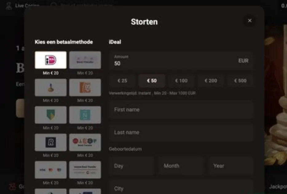 Voor de eerste storting met een van de LegionBet Casino betaalmethoden is het noodzakelijk dat je eerst je persoonlijke gegevens invult. Dit is nodig omdat we je leeftijd en identiteit moeten controleren, betalingen op jouw naam moeten verifiëren en moeten voldoen aan onze anti-fraude- en veiligheidsregels. Als Nederlandse speler is het niet noodzakelijk om bij je eerste storting een identificatieproces te doorlopen dit doe je alleen op het moment van uitbetalen. Hierna doorloop je de stappen hieronder: